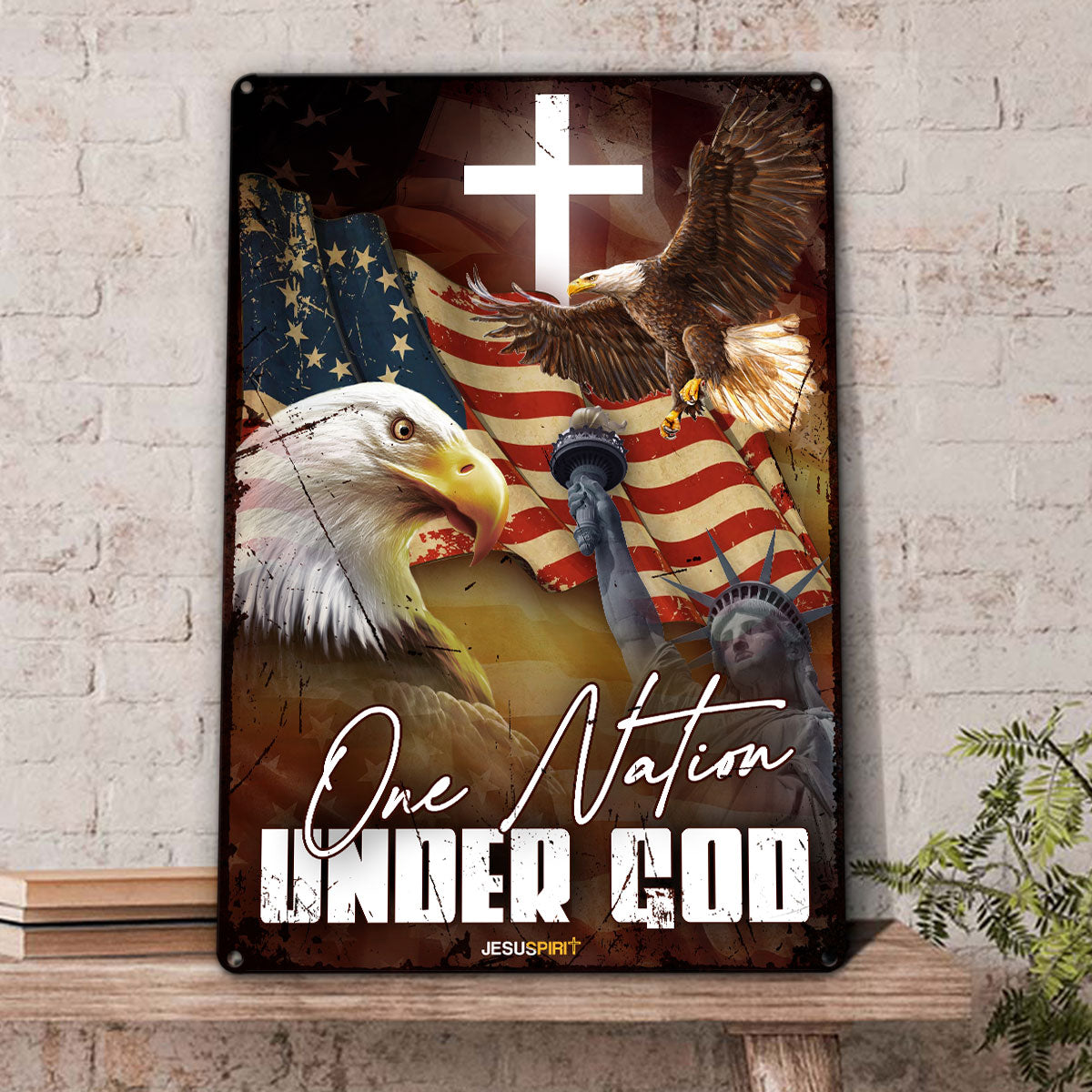 UX Jesus Metal Sign Eagle And Cross One Nation Under God Gift For Christian MS03